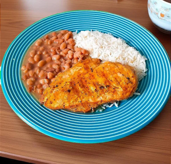 Arroz, feijão, frango, ovo, legumes, fruta.