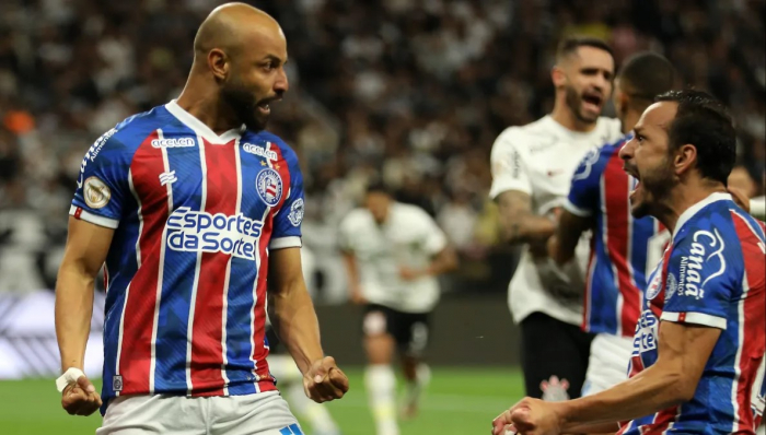 Thaciano comemora um dos dois gols que marcou na Neo Química Arena sobre o Corinthians Felipe Oliveira/EC Bahia Irreconhecível, o Corinthians foi goleado por 5 a 1 pelo Bahia em plena Neo Química Arena, nesta sexta-feira (24), na abertura da 35ª rodada do Brasileirão. Foi a maior goleada do time baiano na história do confronto entre as duas equipes.