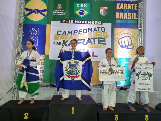 – ouro no Kumite cadete feminino – 47kg, com Ana Luiza Santos;