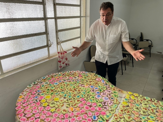 Durante o ano realizamos diversas ações para ajudar na construção do nosso Santuário. A bolacha é mais uma ideia que tive para ajudar no pagamento dos pedreiros da obra. Lancei o desafio para as senhoras da comunidade, elas aceitaram e já vendemos mais de 150 pacotes. O objetivo é continuar com esta ação, destaca o padre