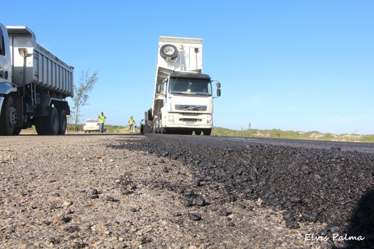 Em ritmo acelerado, a obra de pavimentação asfáltica da estrada geral de acesso à Praia do Sol, recebeu a primeira camada de asfalto nesta quinta-feira, 21.