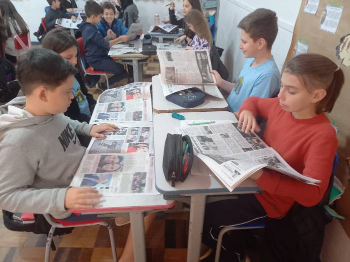 No início deste segundo semestre, os alunos do 5° ano da EMEB João Hilário de Mello estão focados no gênero textual "Notícia". Com base nesse tema, a professora Regiane Cancelier, juntamente com a profissional de apoio Raiany Guarezi, utilizaram jornal impresso diário como ferramenta para desenvolver o projeto.