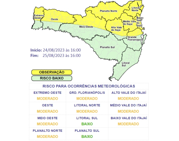 De acordo com o Aviso Meteorológico emitido pela Defesa Civil de Santa Catarina, entre a tarde desta quinta-feira, dia 24 e sexta-feira, dia 25, a aproximação de uma massa de ar frio, que avança do Rio Grande do Sul em direção a Santa Catarina, favorece o declínio acentuado das temperaturas.