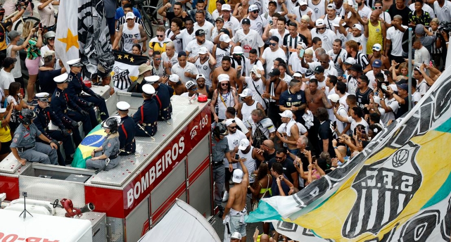 Após o fechamento dos portões, o caixão com o corpo de Pelé deixou a Vila Belmiro estádio em cima de um caminhão dos Bombeiros para cortejo pelas ruas da cidade litorânea paulista. No trajeto está a Avenida Coronel Joaquim Montenegro (Canal 6), onde vive Celeste Arantes, mãe de Pelé. O cortejo chegará ao fim no Memorial Necrópole Ecumênica, onde ocorre o sepultamento ao meio dia, em cerimônia restrita à família.