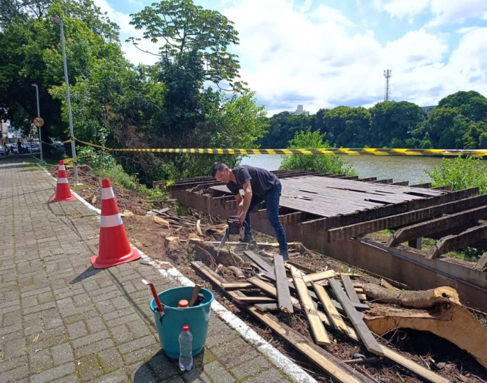 Interditado após apresentar problemas estruturais, o deck de madeira da rua Lauro Müller, em Tubarão, está passando por uma reconstrução completa. A estrutura foi totalmente desmontada após uma vistoria apontar risco aos pedestres, o que levou ao bloqueio do local até que as melhorias fossem iniciadas.