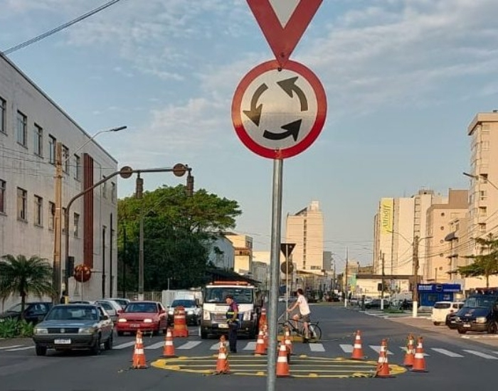 Com isso, o conjunto de semáforos que durante anos funcionou no cruzamento será removido. A rotatória definitiva terá o mesmo material utilizado no período de testes, com tachões formando o círculo com as faixas na cor amarela.