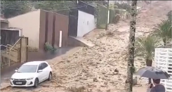 Uma moradora do Bairro Escola Agrícola registrou o momento da avalanche - Foto: Redes Sociais/Divulgação Um deslizamento de terra de grandes proporções está colocando em risco residências de moradores da Rua Netuno, em Blumenau.