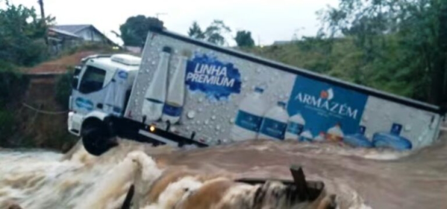 Um caminhão carregado com água mineral caiu de uma ponte de madeira na localidade de São Roque, em Gravatal. O acidente ocorreu na manhã desta quarta-feira (10).