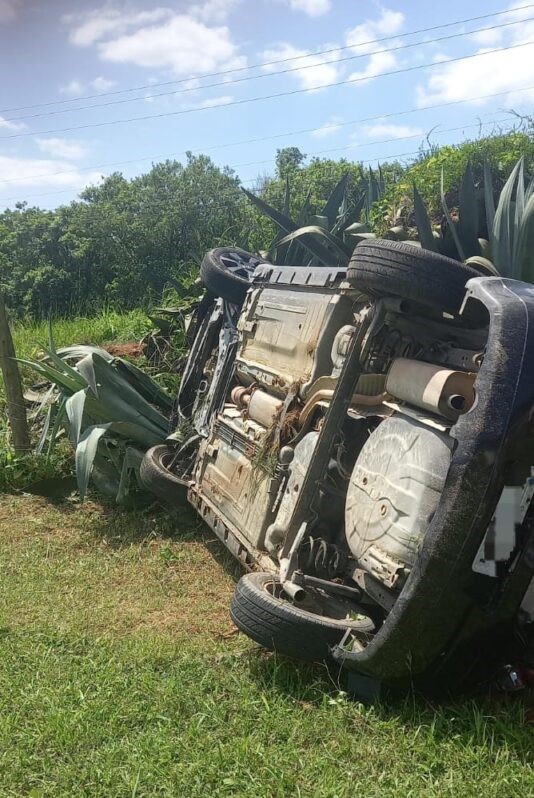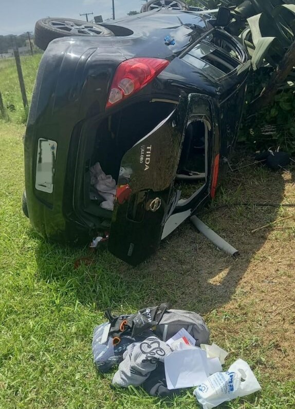 Um carro, com cinco pessoas, capotou ao lado do quartel do Corpo de Bombeiros, em Urussanga. O acidente ocorreu na rodovia Genésio Mazon, no bairro De Villa, onde está a nova sede da guarnição. O fato foi registrado por volta das 13h15 dessa segunda-feira, dia 6. Conforme os bombeiros, o veículo Nissan Tiida capotou às margens da rodovia.