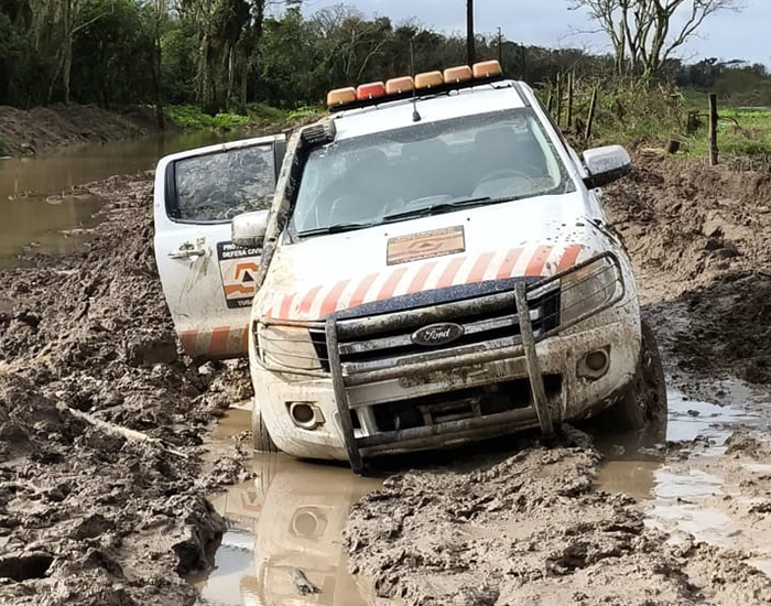 Durante avaliações pela região, até mesmo a picape da Defesa Civil acabou atolando na Rodovia Aggeu Medeiros.
