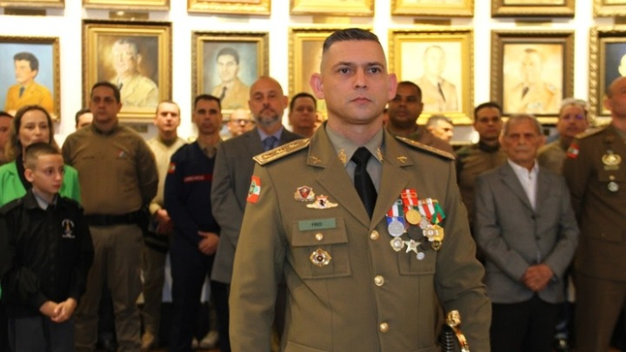 A solenidade reuniu autoridades civis e militares, entre elas o comandante-geral da PMSC, coronel Emerson Fernandes, que destacou a competência do novo chefe de Estado-Maior-Geral.