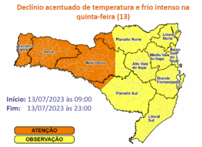 O alerta de “atenção” serve para os municípios do Oeste, parte do Planalto Norte e Sul.