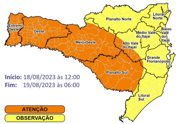 Os temporais devem iniciar pelo Grande Oeste a partir da tarde da sexta, se deslocando para as demais regiões do estado até a manhã do sábado, 19. As chuvas devem vir com maior intensidade entre a tarde e a noite de sexta em áreas do Oeste, Meio-Oeste planaltos e o norte catarinense, onde as altas temperaturas combinadas à instabilidade atmosférica favorecem a ocorrência de tempestades severas.