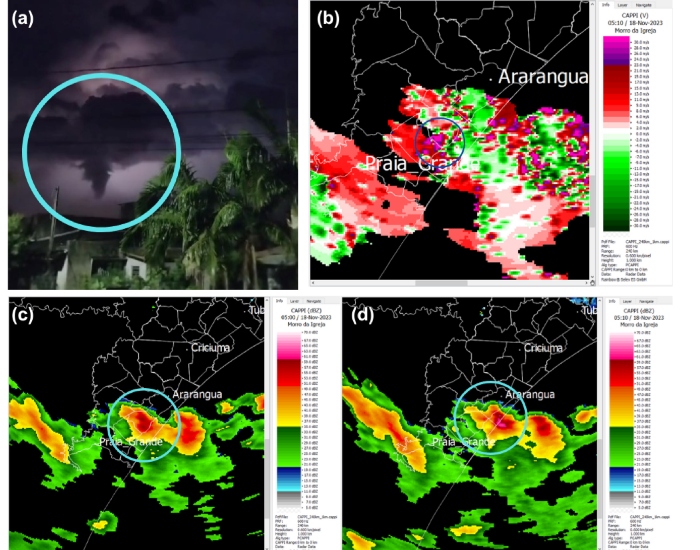 Na figura (a) é mostrado um print de um vídeo feito por moradores de Sombrio, onde é possível identificar a nuvem em formato de funil. Não é possível ver o funil tocando o chão (critério necessário para classificação de tornado), mas ao analisar conjuntamente as imagens dos danos e os produtos do radar meteorológico do Morro da Igreja, fica perceptível a passagem do fenômeno pela região.