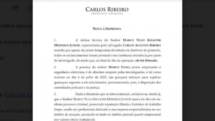 A defesa técnica de MARCO TULIO KELLETER MEDEIROS JUNIOR, representada pelo advogado CARLOS AUGUSTO RIBEIRO ressalta que apesar da prisão temporária decretada em desfavor do primeiro, todos os esclarecimentos foram prestados sem nenhuma resistência por parte do investigado, de modo que, ao final do dia da operação, ele foi liberado.