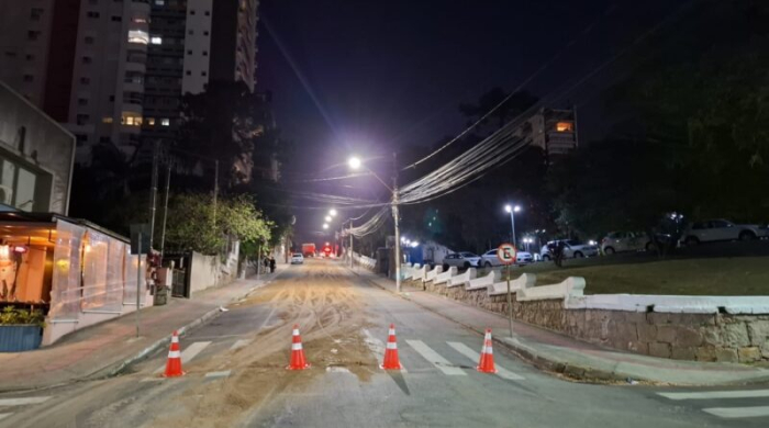 Via em frente à prefeitura segue fechada nesta noite; equipes trabalham na limpeza e não há previsão de liberação do tráfego