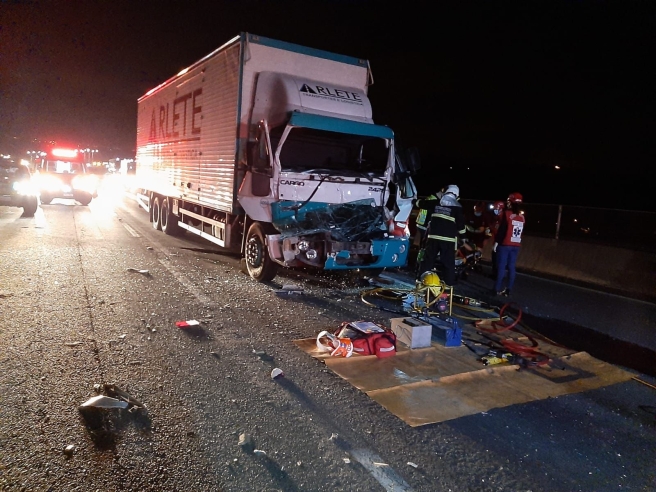 Chegando no local BR 101 km 362, bairro Garganta em Sangão, foi constatado uma colisão traseira entre dois caminhões, sendo que no caminhão Mercedes Atego com placas de Carapicuíba SP o condutor nada sofreu. No outro caminhão um Ford/Cargo de Tubarão o condutor encontrava-se preso a ferragens com hemorragia extensa em membro inferior direito, apresentando sinais de hipovolemia.