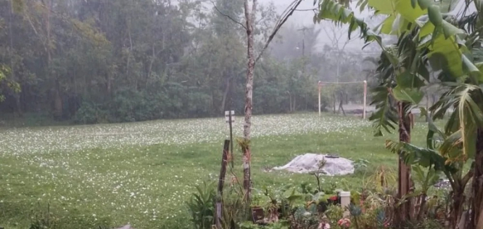 Uma mulher ficou ferida durante a queda de granizo e chuva registrada neste domingo (24) em todo estado. A vítima foi atingida na cabeça por ao menos uma pedra de gelo em Biguaçu, na Grande Florianópolis, e precisou ser levada ao hospital.