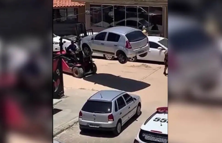 Gravações feitas por moradores da região mostram a empilhadeira levando carros e, em seguida, os veículos sendo colocados em um guincho.