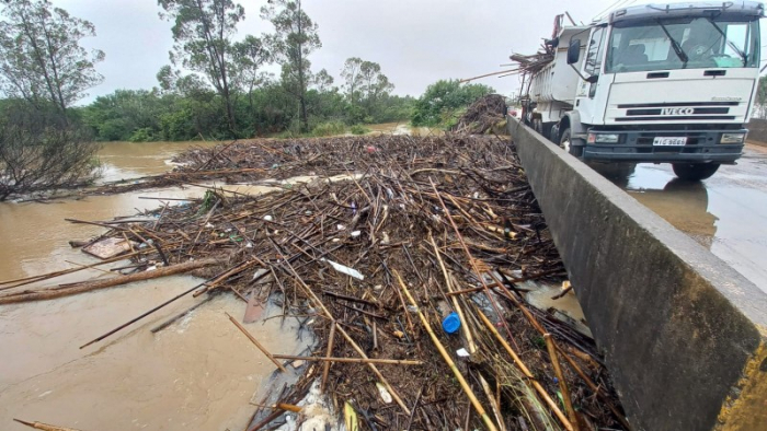 “Ainda precisamos deixar um pouco nas cabeceiras, porque não demos conta de carregar tudo”, contou o coordenador da Defesa Civil de Jaguaruna, Maicon Laureano. “Ainda está descendo muita água e muito entulho. Com certeza vai trancar de novo nas próximas horas e vamos ter que retirar mais uma vez”, disse.