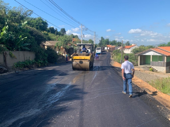 As obras de pavimentação da estrada geral de Congonhas seguem em ritmo acelerado. Nesta terça-feira (21), um trecho de 400 metros de extensão recebeu a capa asfáltica, além de outros acabamentos como colocação de grama em algumas encostas.
