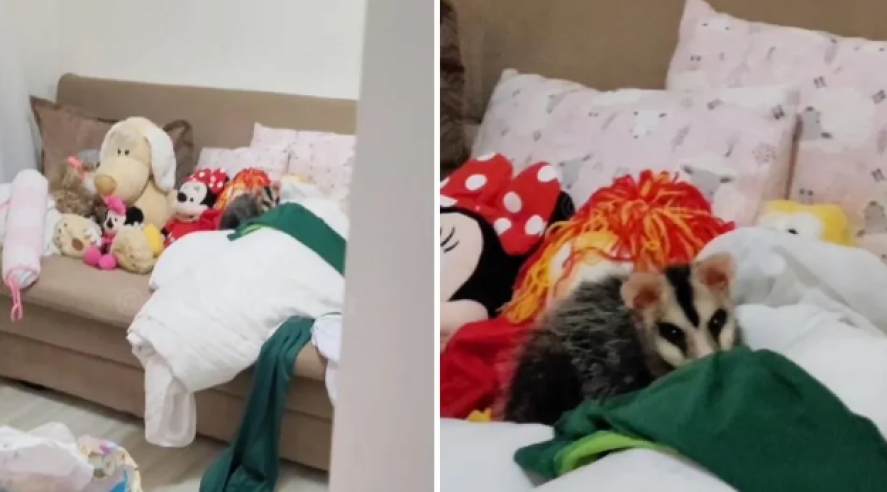 Um gambá foi encontrado em meio a almofadas e bichos de pelúcia no quarto de uma menina de 5 anos em Jaraguá do Sul, no Norte catarinense. A captura foi registrada em vídeo pelo biólogo o Gilberto Duwe (assista acima).