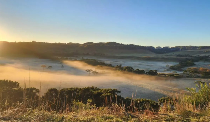 A Serra catarinense amanheceu coberta pela geada nesta terça-feira (29), em mais um espetáculo do outono. A frente fria que trouxe chuvas no domingo (27) se afastou do estado e deu lugar à massa de ar frio e seco, que fez as temperaturas despencarem durante a madrugada.