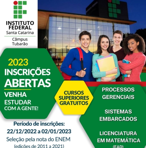O IFSC Tubarão está com inscrições abertas para novos cursos superiores. No total são três os cursos ofertados, sendo um deles EAD (à distância). Os interessados têm até o dia 2 de janeiro de 2023 para realizar sua inscrição.