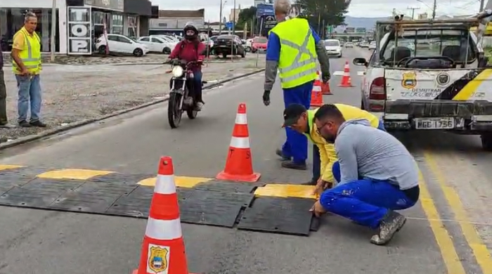 A Diretoria Municipal de Trânsito – DEMUTRAN acompanhada da Secretaria de Infraestrutura – SEINFRA estão realizando a instalação e os testes na via. As lombadas tem uma estrutura emborrachada e servirão para reduzir a velocidade na via e reduzir acidentes.