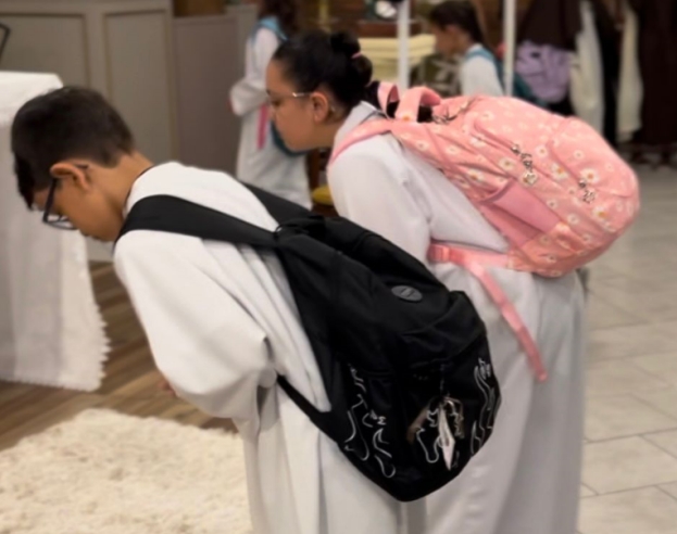Além dos estudantes, todos os coroinhas e meninas de Santa Teresinha que serviram o altar, desempenharam a função com as mochilas nas costas.