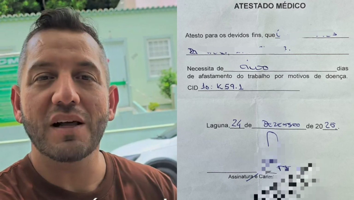 Ele relatou que uma colaboradora de sua empresa conseguiu um atestado médico com a data de 24 de dezembro de 2025. Porém, segundo ele, a clínica estava fechada neste dia e o médico em questão não estava nem na cidade.