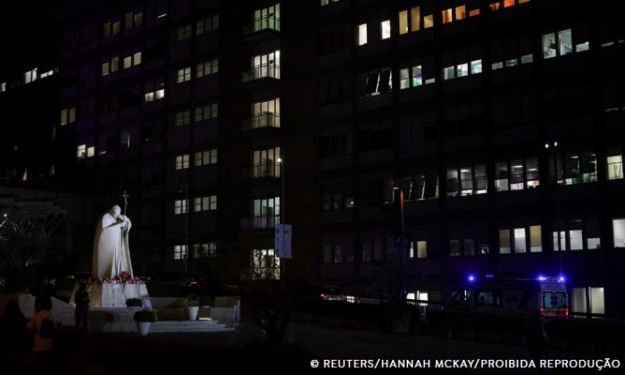 Agora, o papa está recebendo essa ventilação apenas à noite, segundo o Vaticano. Durante o dia, ele recebe oxigênio por uma pequena mangueira sob o nariz. Francisco não é visto em público desde a sua internação. É a maior ausência do pontífice desde o início do seu papado, há 12 anos.