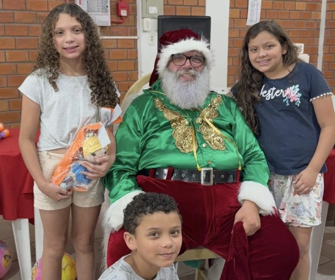 Após a reflexão, em um momento de alegria e simbolismo, o Papai Noel, tradicional ícone do Natal, foi convidado a participar da ação, realizando a entrega dos presentes às crianças e emocionando as famílias presentes.
