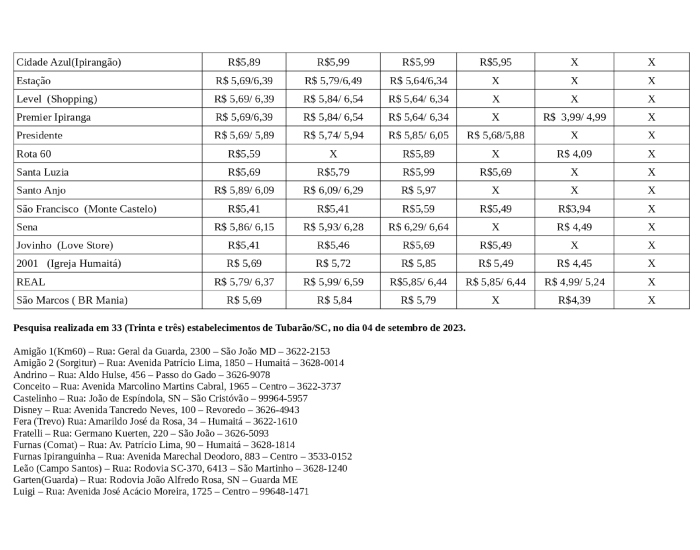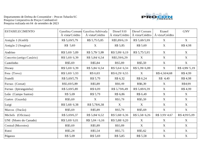 O Procon de Tubarão divulgou nesta quarta-feira, dia 6, uma pesquisa comparativa de preços de combustíveis no município, realizada em 33 estabelecimentos diferentes.