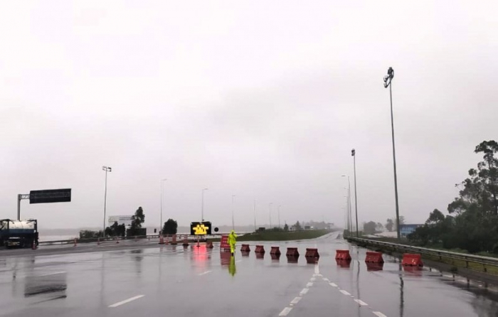 A pista Norte, no km 403 da BR-101 em Araranguá, segue interditada na manhã desta terça-feira, dia 10. O fluxo no sentido Norte foi desviado para a pista Sul, que está em mão dupla com uma faixa em cada sentido. O trecho da pista Norte foi interditado no fim de semana, após ficar alagada por conta da volumosa chuva que atingiu Santa Catarina.