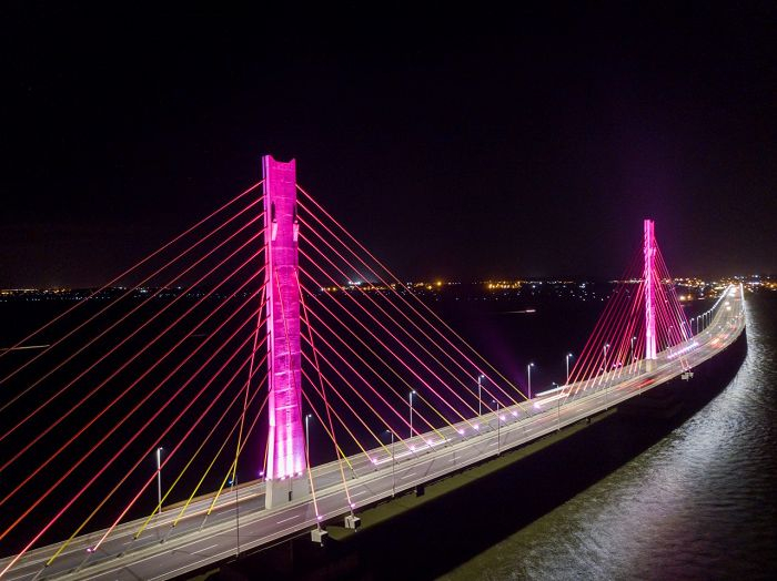 Foto: Divulgação A Ponte Anita Garibaldi, um dos principais cartões-postais de Laguna, está iluminada na cor rosa durante todo o mês de outubro em apoio à campanha Outubro Rosa.