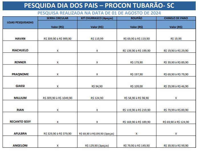 Foto: Reprodução O Procon realizou uma pesquisa de preços no comércio local sobre os produtos mais procurados para o Dia dos Pais. Os agentes de fiscalização compareceram em 10 lojas e pesquisaram os preços dos seguintes produtos: serra circular, kit churrasco, roupão e chinelo de pano.