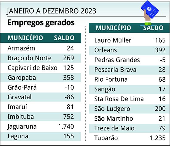 Jaguaruna, Tubarão e Imbituba foram as três cidades com mais empregos gerados no ano passado, com, respectivamente, 1.740, 1.235 e 752 admissões a mais que desligamentos.