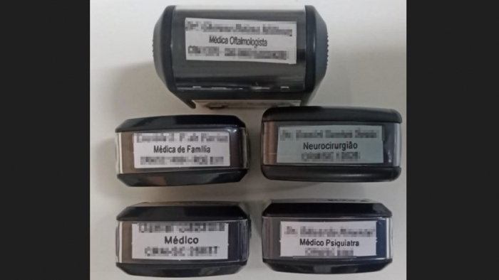 Durante as buscas, foram localizados na casa do suspeito blocos de atestados médicos subtraídos de diferentes hospitais, e também carimbos de diferentes médicos e especialidades – médico da família, oftalmologista, psiquiatra e até neurocirurgião.