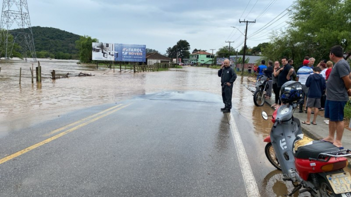 Foto: Iago Zeferino O Rio Tubarão transbordou na altura do Km 60 e acesso ao Km 63, em Tubarão. As autoridades estão em alerta máximo devido à situação crítica que se desenrola às margens da rodovia.
