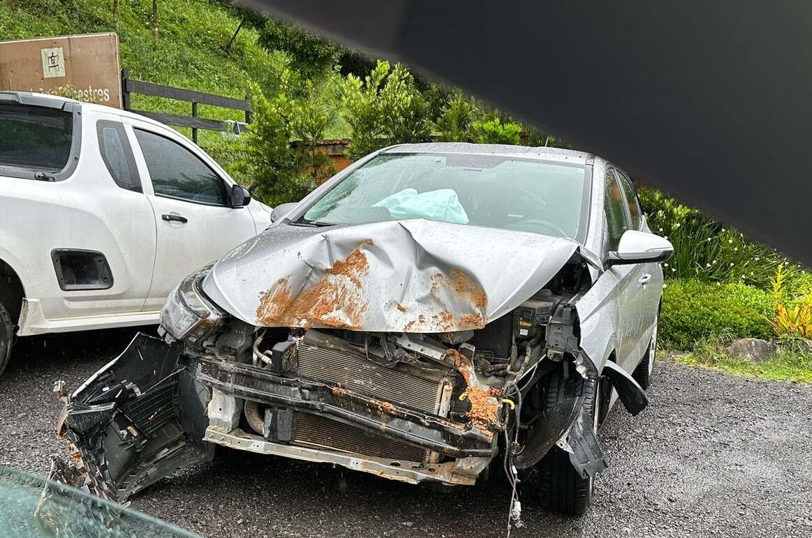 Ainda na manhã desta sexta-feira, uma grande pedra se desprendeu e caiu na pista da rodovia SC-110, em Urubici, atingindo um carro. O acidente aconteceu no Km 380, próximo ao mirante da cidade.
