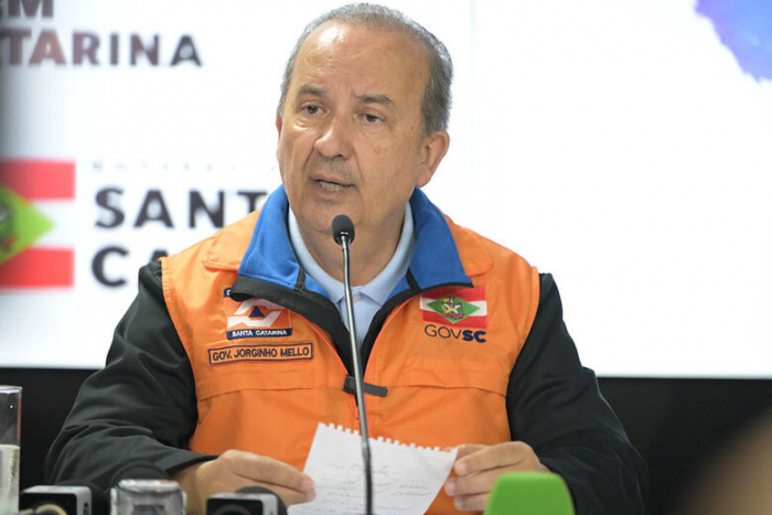 Foto: Secom Em coletiva de imprensa, da sede da Defesa Civil de Santa Catarina, o governador Jorginho Mello conclamou a população que mora em áreas de risco a buscar abrigo seguro nos municípios afetados pela enchente no estado. O pedido se dá em meio à previsão de mais chuva neste domingo (8) e aos prognósticos técnicos que apontam que os rios podem atingir níveis expressivos de 14 metros, como em Rio do Sul, no Alto Vale do Itajaí.