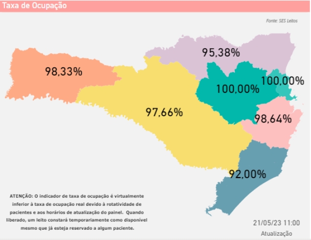 Também há quatro regiões com 100% de ocupação neste domingo (21) ao levar em conta os leitos neonatais. São elas: Oeste, Foz do Rio Itajaí, Grande Florianópolis e Sul. A taxa geral é de 95,80%.