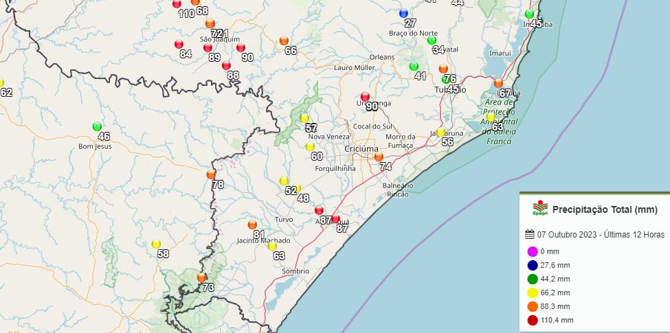 A previsão de chuva intensa e contínua para o Sul de Santa Catarina durante o fim de semana vai se confirmando. Entre a tarde dessa sexta-feira e madrugada deste sábado, dias 6 e 7, o volume de água que caiu sobre a região foi elevado, considerando o curto período de tempo.