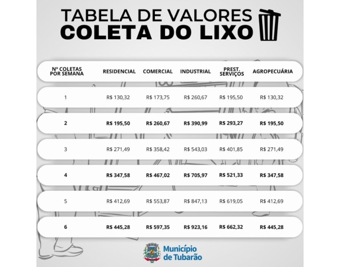 A Secretaria de Fazenda do município de Tubarão divulgou a tabela de valores referente à taxa de coleta de lixo para o exercício 2024.