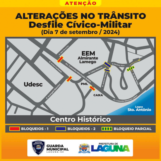 No sábado (7), o trânsito de Laguna sofrerá alterações. A ação ocorre por conta do Desfile Cívico. Várias ruas serão afetadas. O pedido é para que todos tenham compreensão e atenção redobrada para as sinalizações, dessa forma poderá se garantir um 7 de setembro com segurança e organização. Abaixo as mudanças divulgadas pela prefeitura do município.