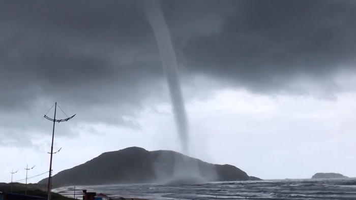 Foto: Tiago Moritz / CBMSC Foi avistada no período da manhã desta sexta-feira, 26, uma tromba d’água na Praia do Santinho, no município de Florianópolis. Este tipo de fenômeno, embora sejam semelhantes a tornados, geralmente não são tão intensos e têm uma vida útil curta.