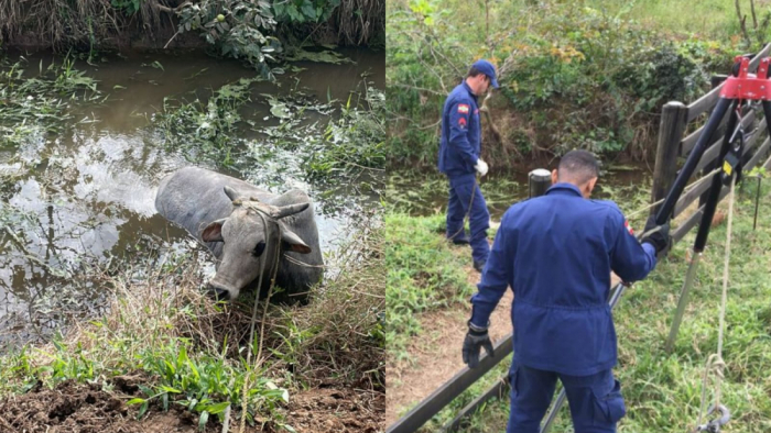 No local, os bombeiros se depararam com uma situação delicada envolvendo uma vaca que havia ficado presa dentro de um córrego. Segundo informações, o animal estava desaparecido há dois dias.
