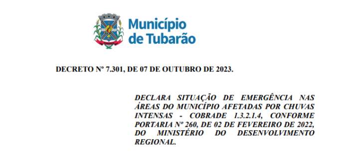 Diante da situação, o prefeito de Tubarão anunciou oficialmente o estado de emergência na cidade, demonstrando a necessidade de medidas preventivas e rápidas para garantir a segurança da população. Desde o dia anterior, o município já preparou abrigos para acolher aqueles que precisassem deixar suas casas devido a alagamentos. Novos locais também já estão sendo preparados.