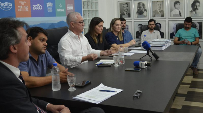 O prefeito Jairo Cascaes, acompanhado da Gestora-coordenadora de Convênios e Projetos Débora Pinter, do Procurador-geral do município Marlon Collaço Pereira, do Gerente de obras Guilherme Daufemback, da gerente de Gestão Karla Cipriano e dos engenheiros Ingo de Quadro e Amilton Lemos Júnior, concedeu na tarde desta quarta-feira (25), entrevista coletiva para esclarecer as orientações do Tribunal de Contas de Santa Catarina (TCE-SC), a respeito do edital de Concorrência n. 05/2023.